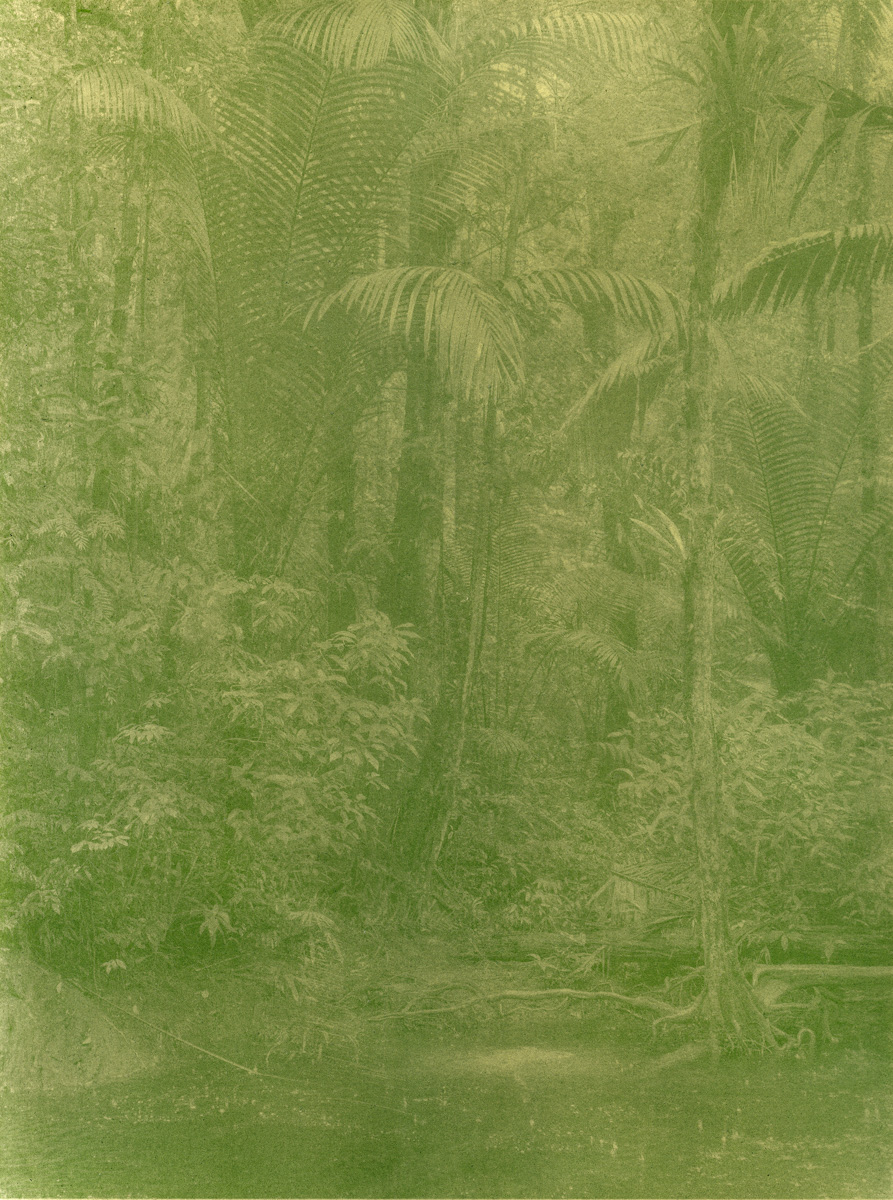 During the time spent in the Peruvian Amazon for their project Aya, the artists worked with indigenous communities to identify photosensitive plants from which they extracted the juice. The organic emulsion was then used, in reaction to sunlight, to capture the very ecosystem from which it was extracted. All prints were made in the Amazon Rainforest.