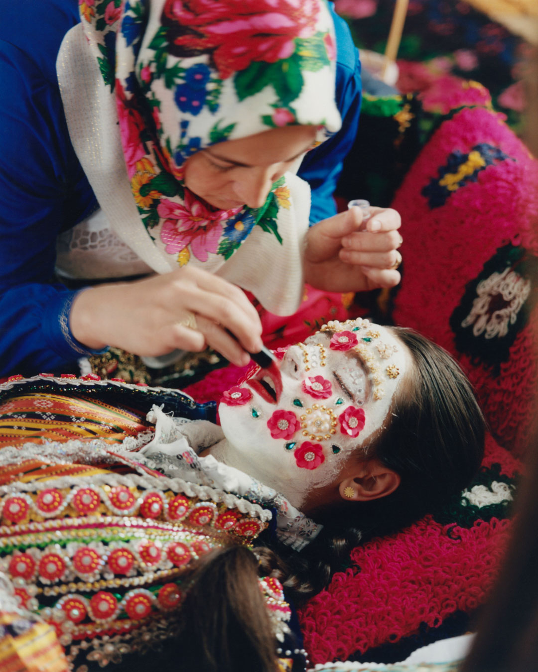 In Ribnovo, the Gelina bridal makeup is an important part of the Pomak wedding tradition. Pomak brides traditionally wear elaborate makeup for their Gelina ceremony, symbolising purity and piety. The intricate makeup, once made from natural ingredients, has gradually incorporated modern cosmetics and decorative additions. During the final stage of the Pomak wedding ceremony, the bride keeps her eyes closed in order to ward off the evil eye, and only reopens them in her new marital home, the process marking her liminal transition into her married life.