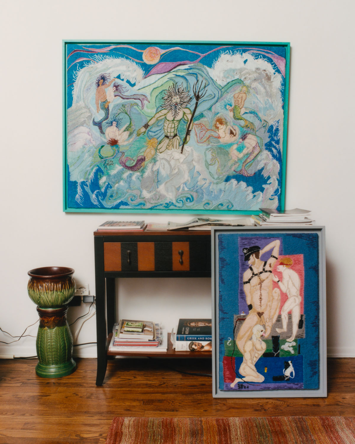 In the past five years, Salandra’s brightly colored “thread paintings” have shifted toward explicit, large-scale scenes that merge Catholic imagery with sexual subculture. Drawing on religion, personal experience, and pornography, his meticulously stitched works recast fetish and devotion within the same frame.