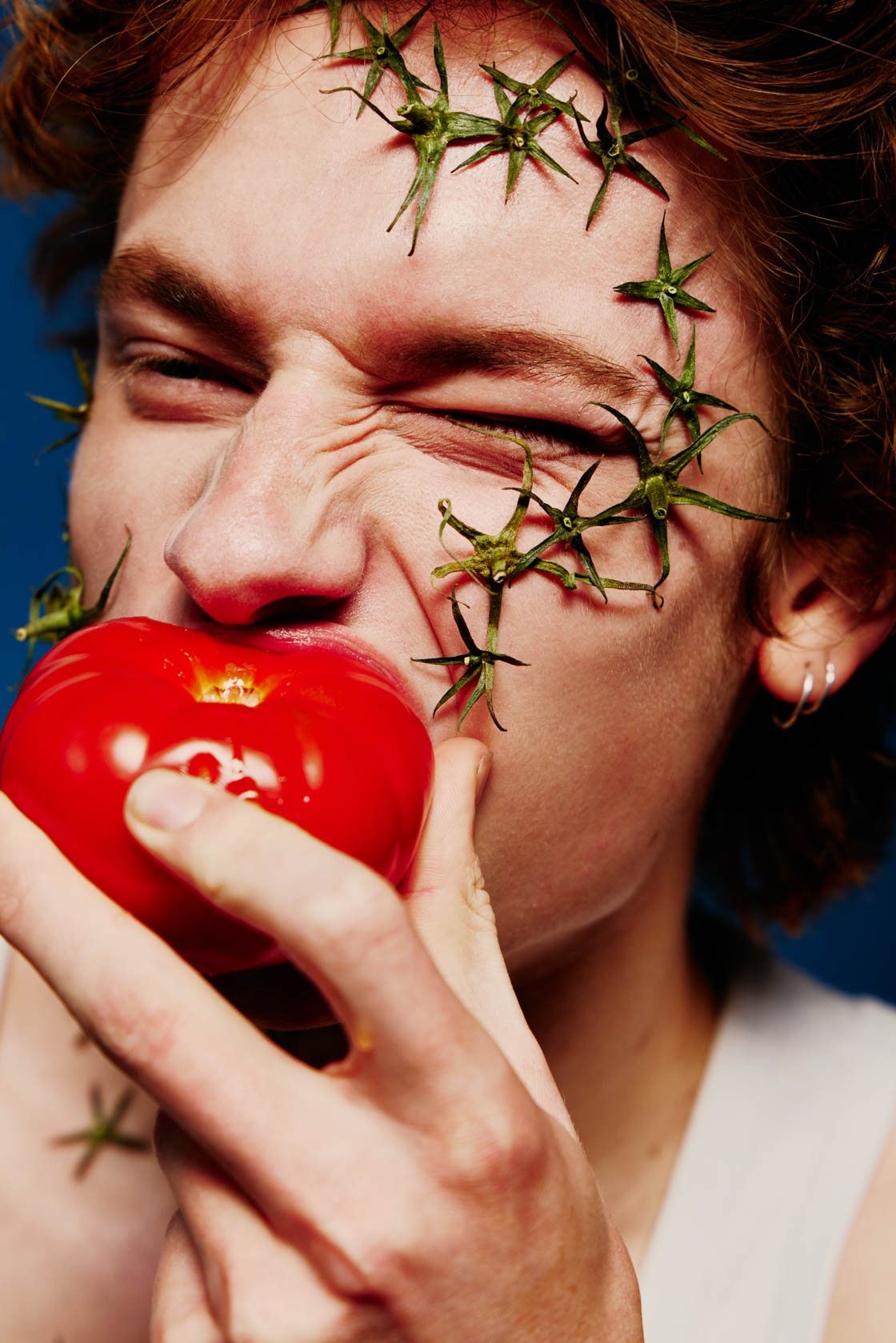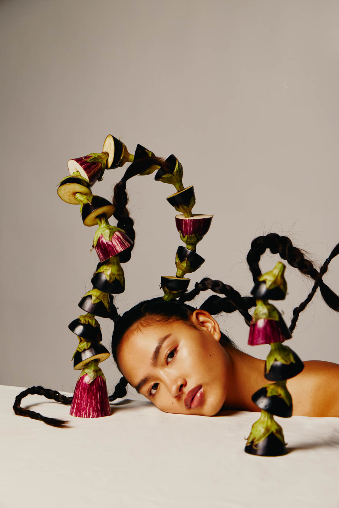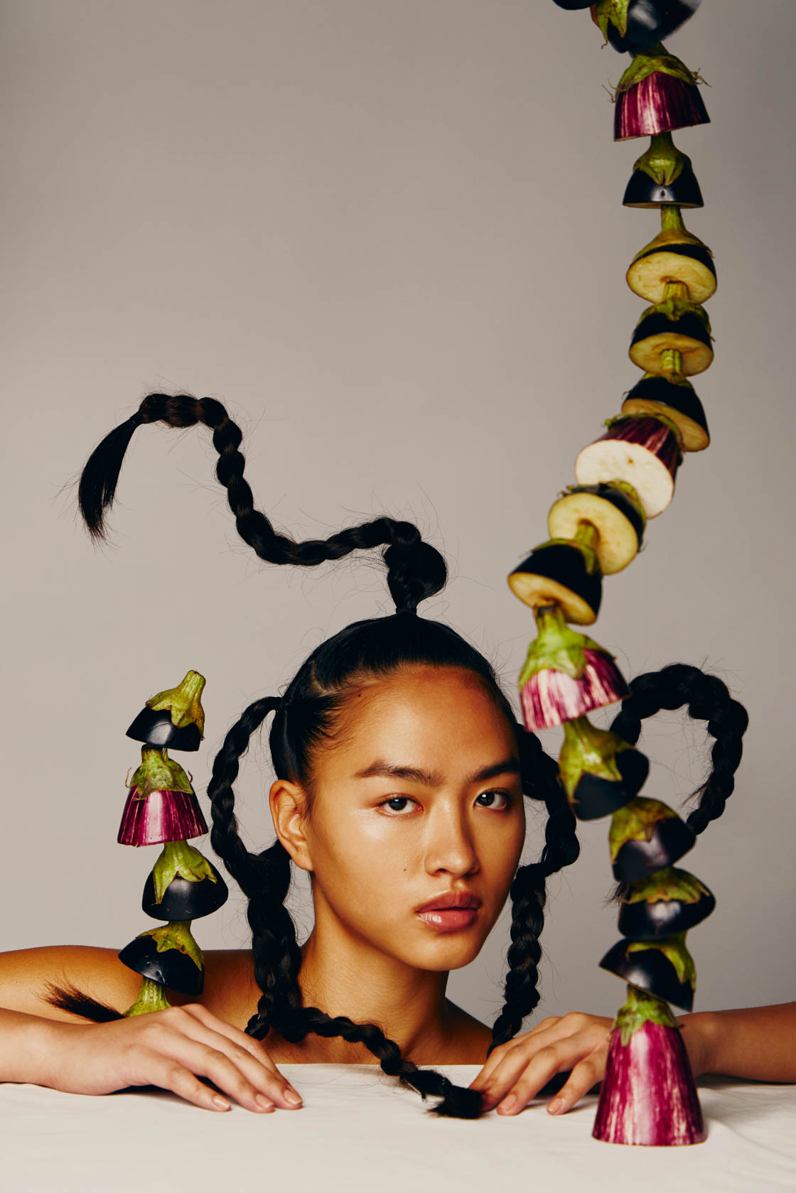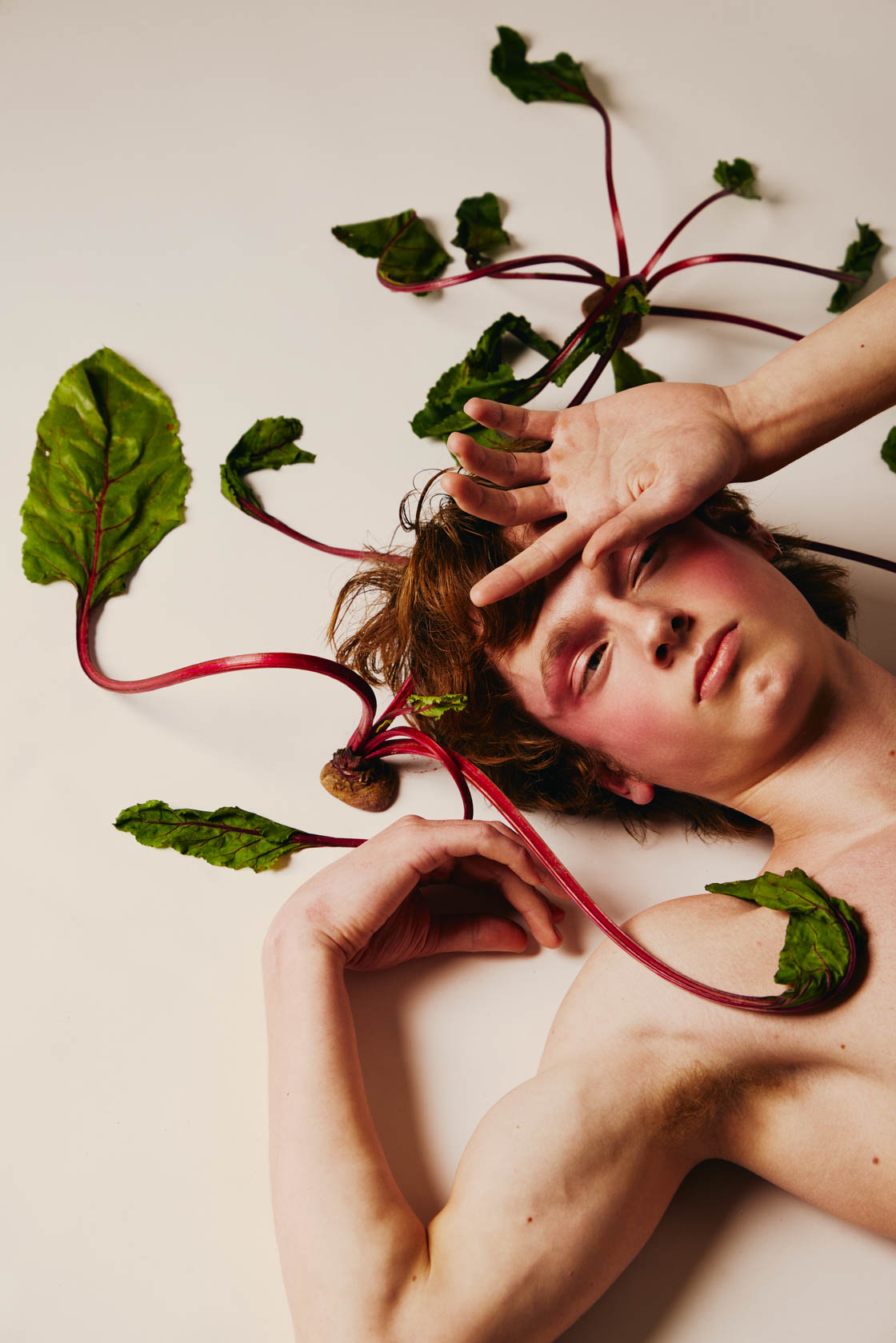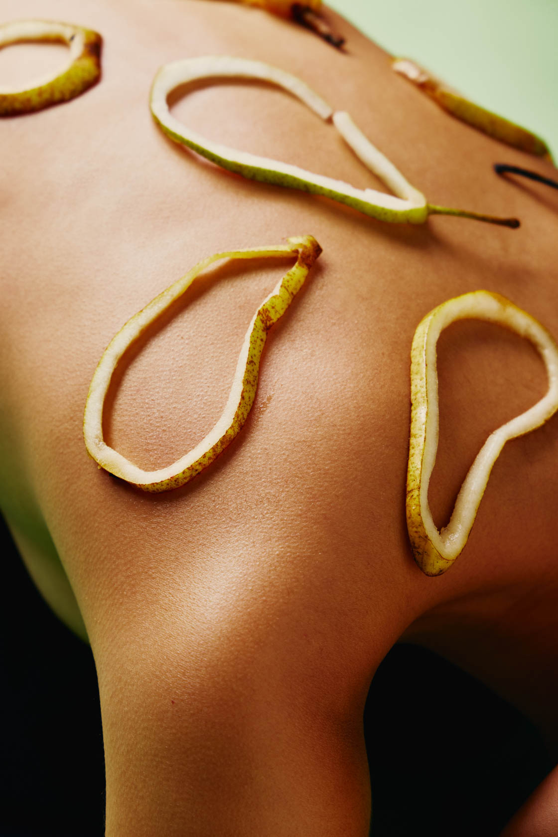 By placing fruit peels, stems and vegetables scraps on the body, and styling them in unconventional ways, the duo revealed their overlooked character – transforming remnants into elements of playfulness, texture and form.